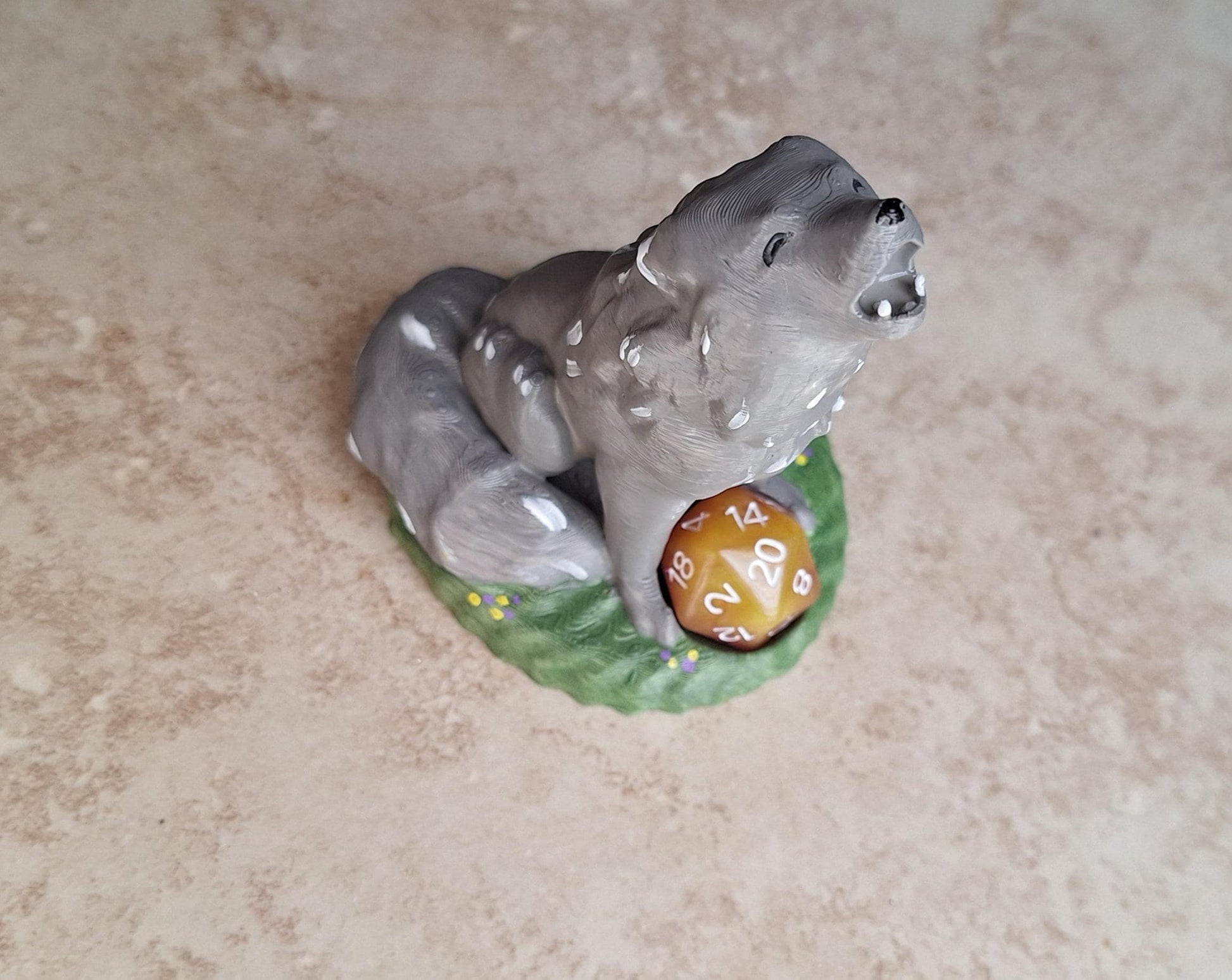 3D printed and painted gray wolf dice guardian / 3d white grey howling wolf dice buddy / 3d printed d20 dice guardian