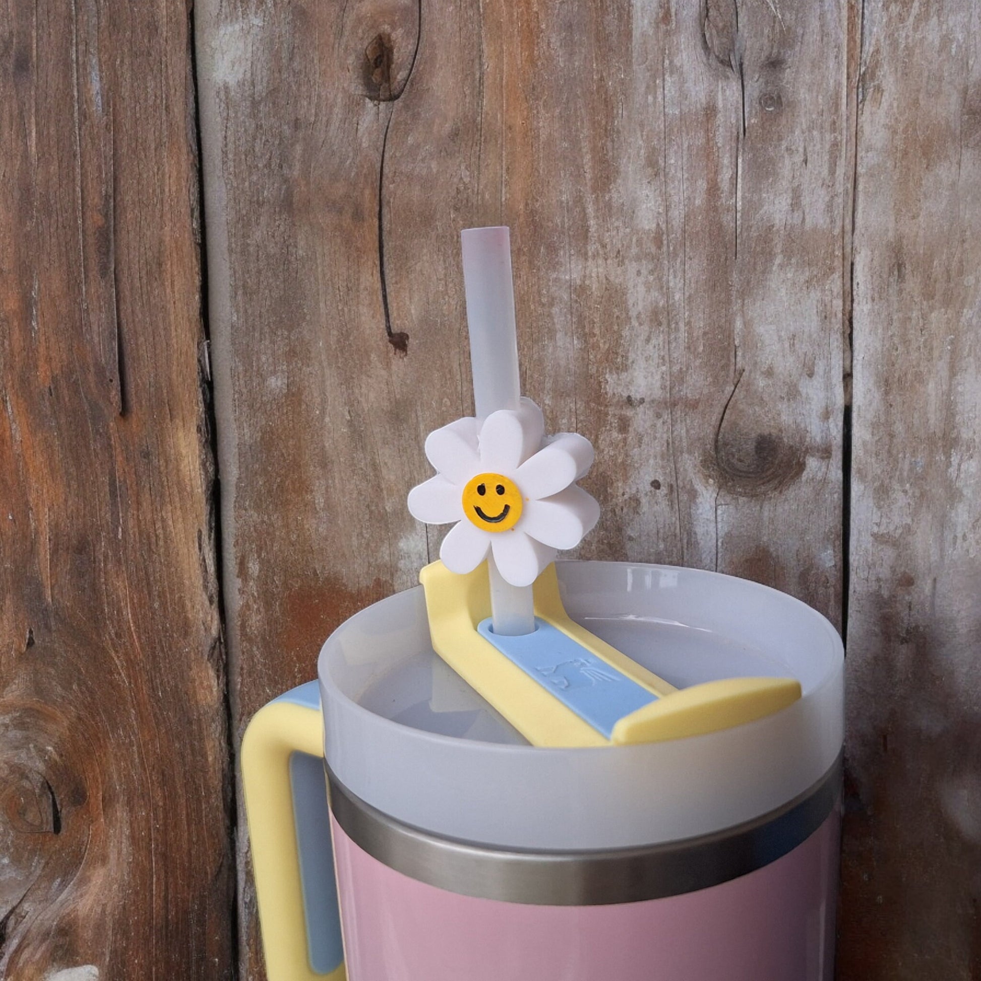 3D printed white purple flower straw buddy charm tumbler accessories / tumbler charm straw buddy / smiley daisy straw topper charm