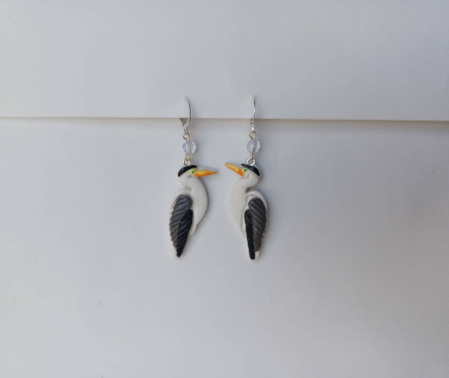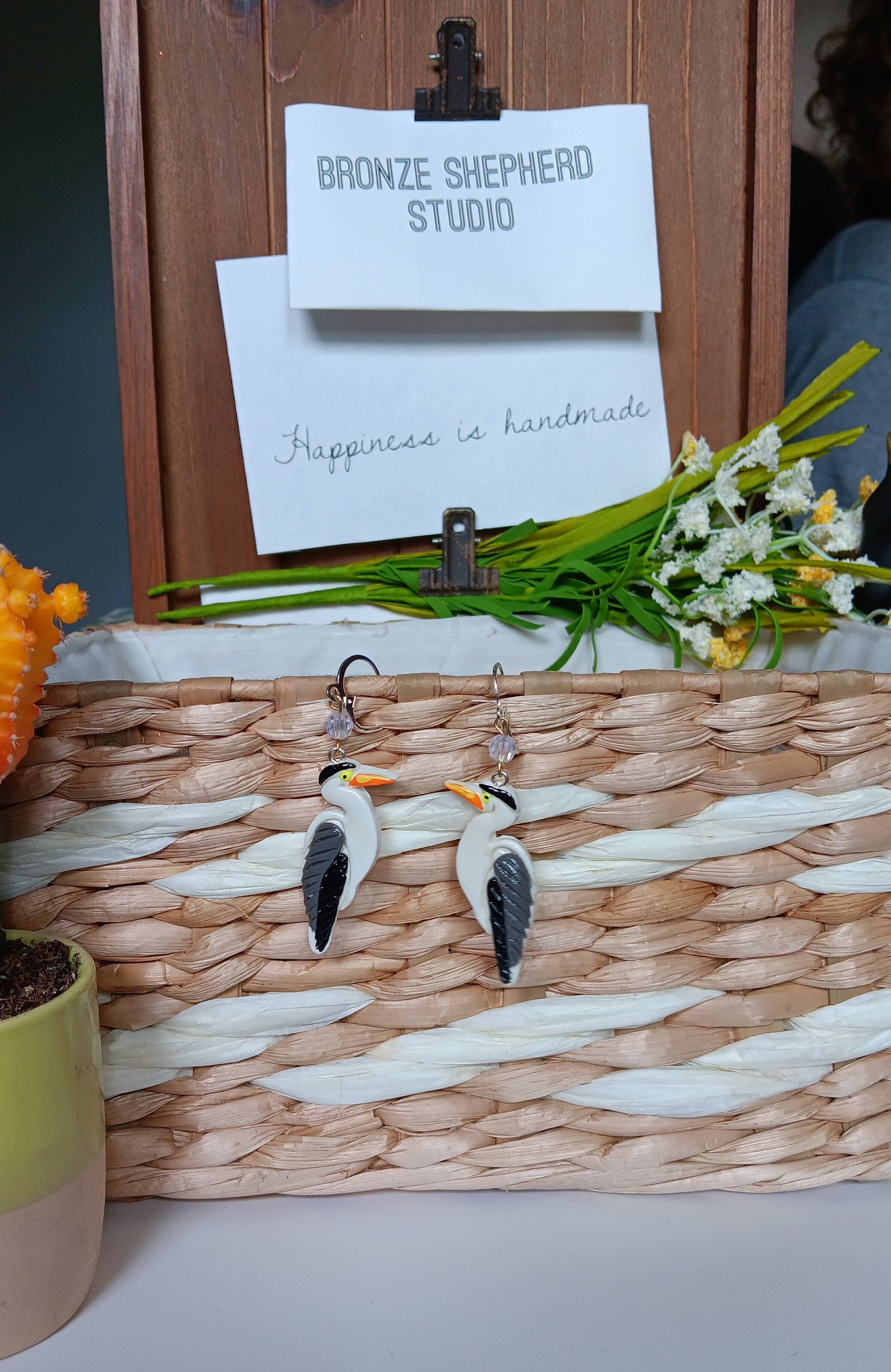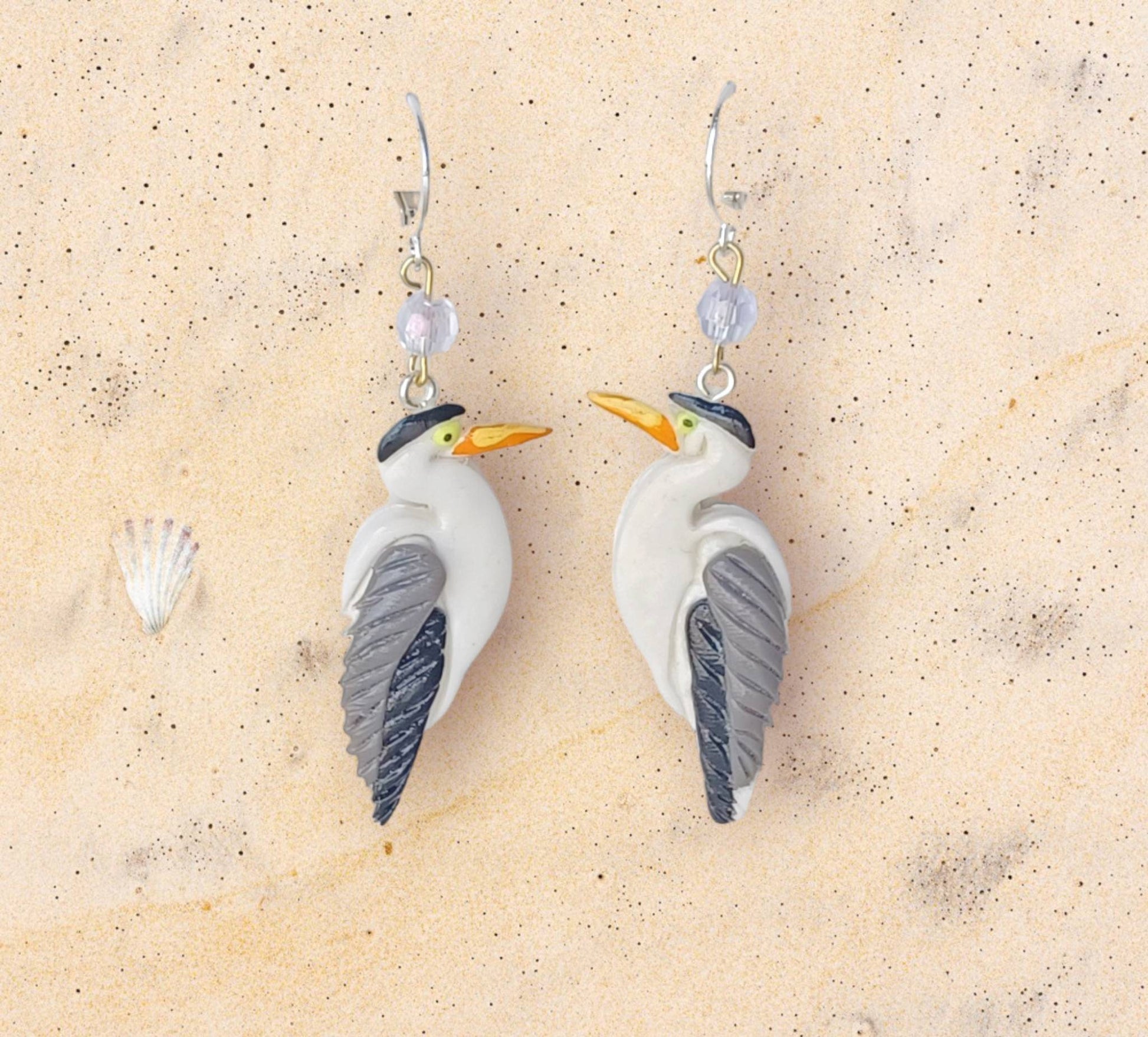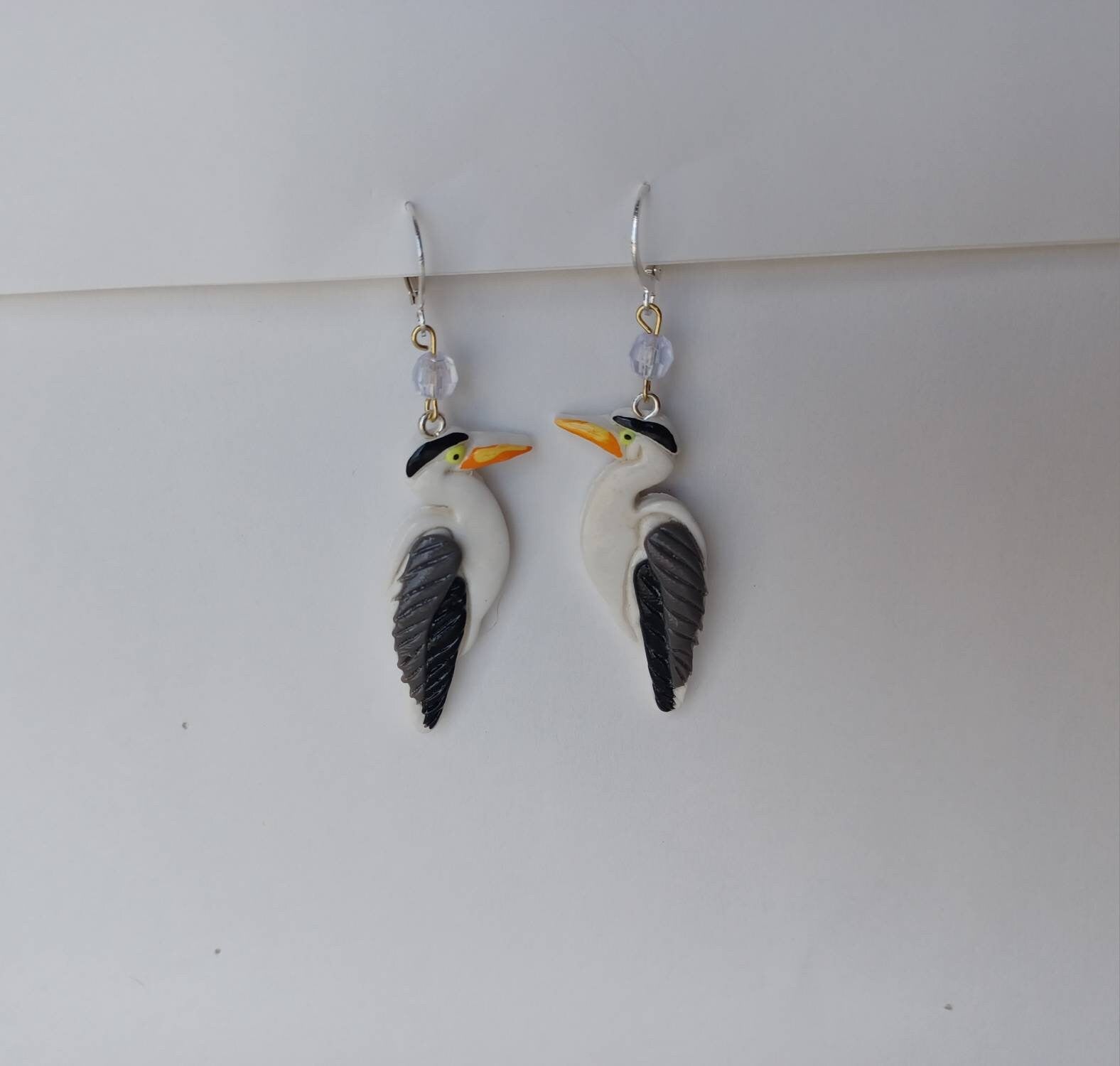 Kawaii blue heron earrings / polymer clay blue heron crane dangle earrings / kawaii bird jewelry / clay bird jewelry