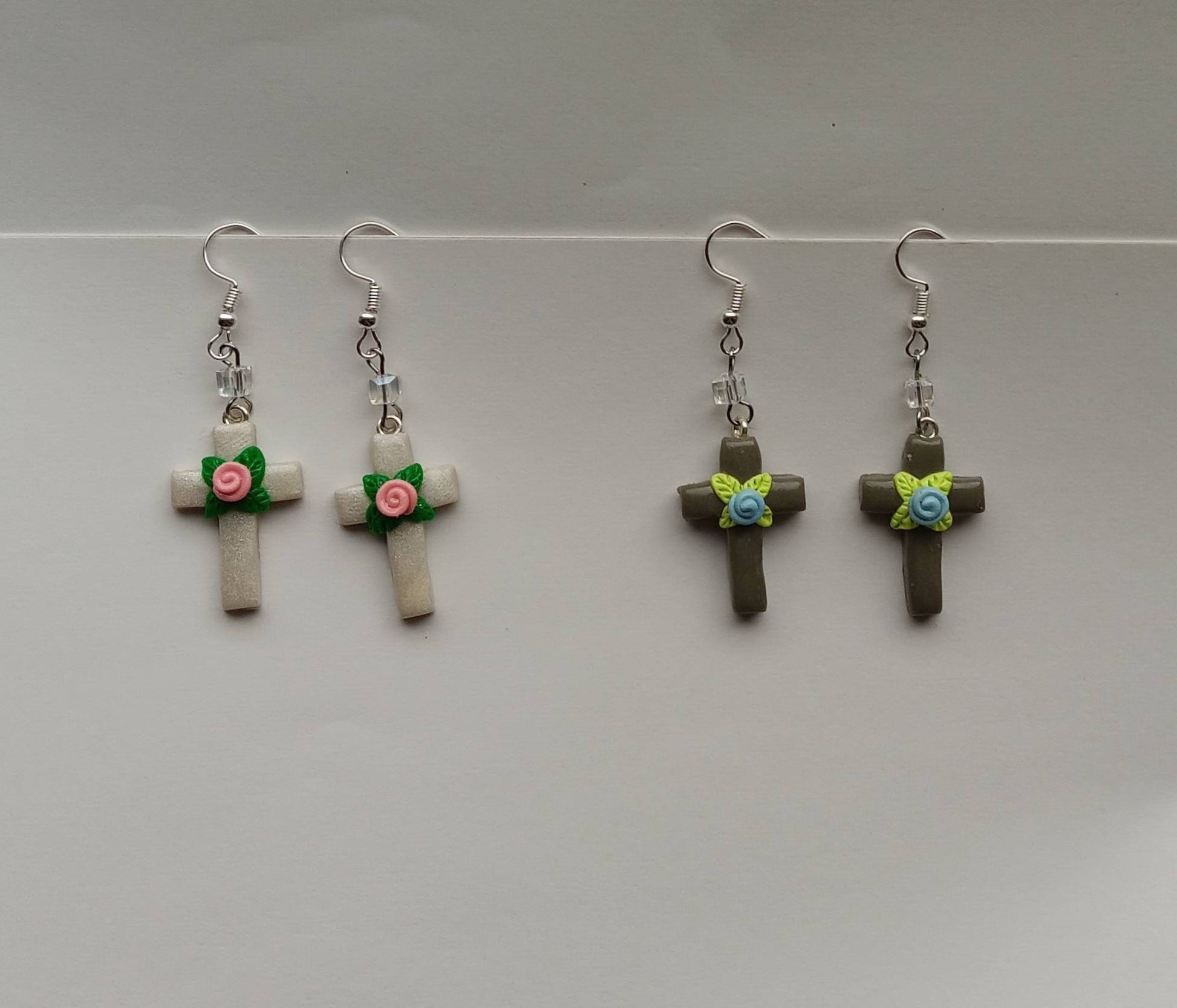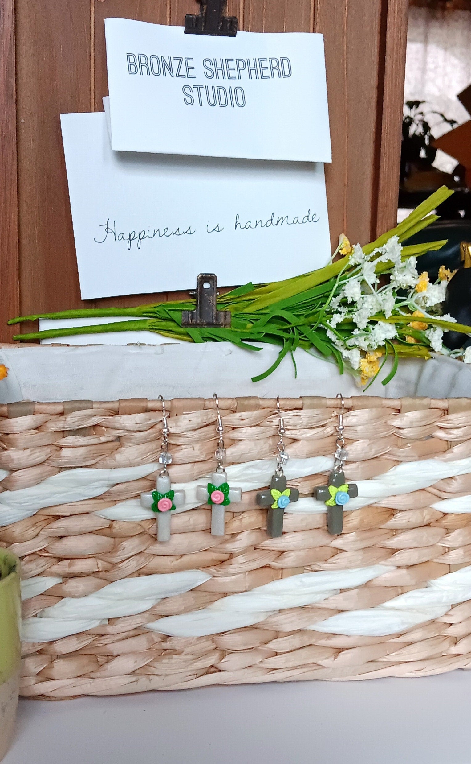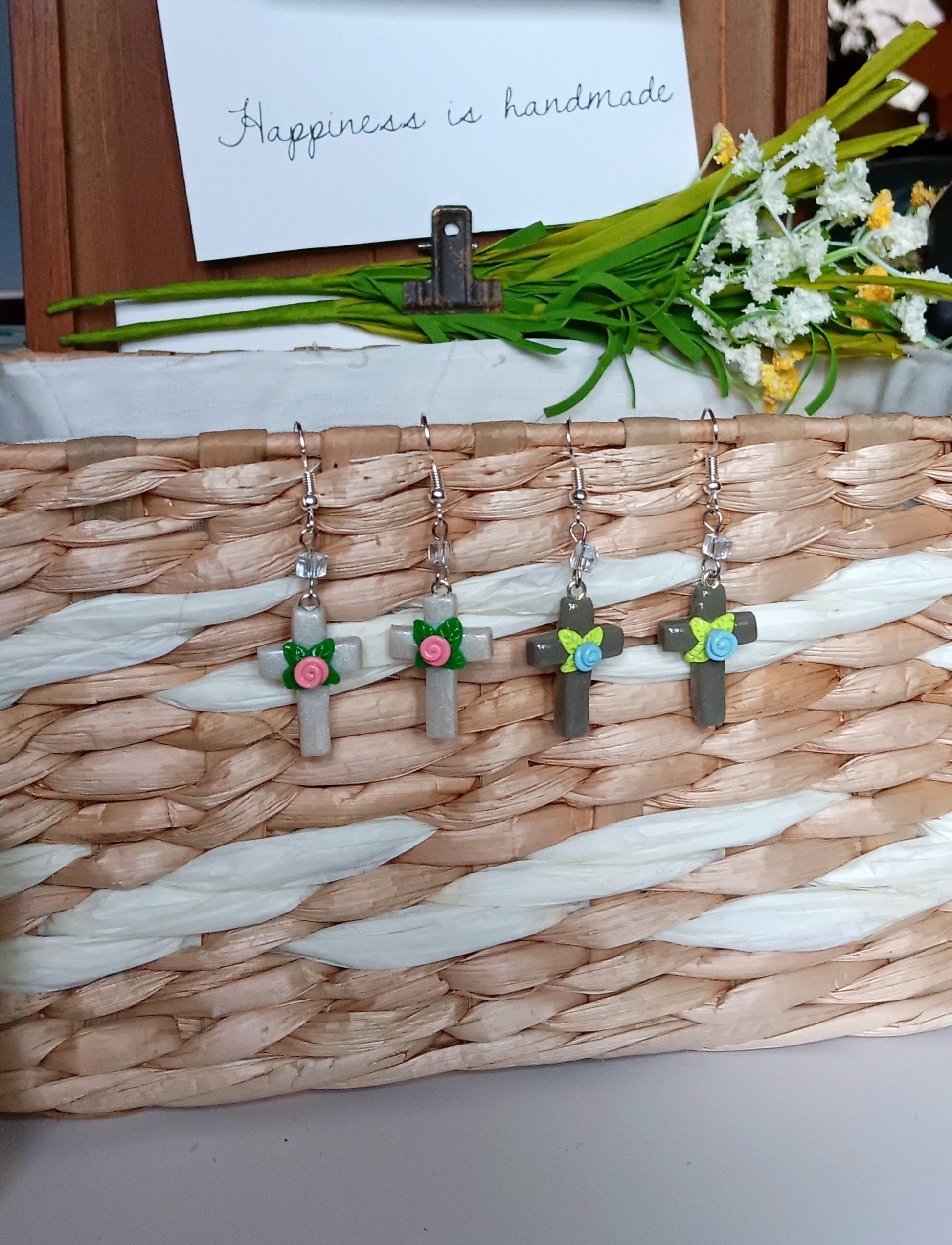 Kawaii floral cross earrings / polymer clay rose cross dangle earrings / clay faith Christian jewelry / floral rose cross earrings