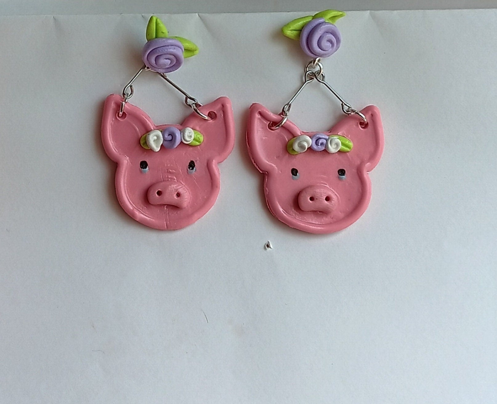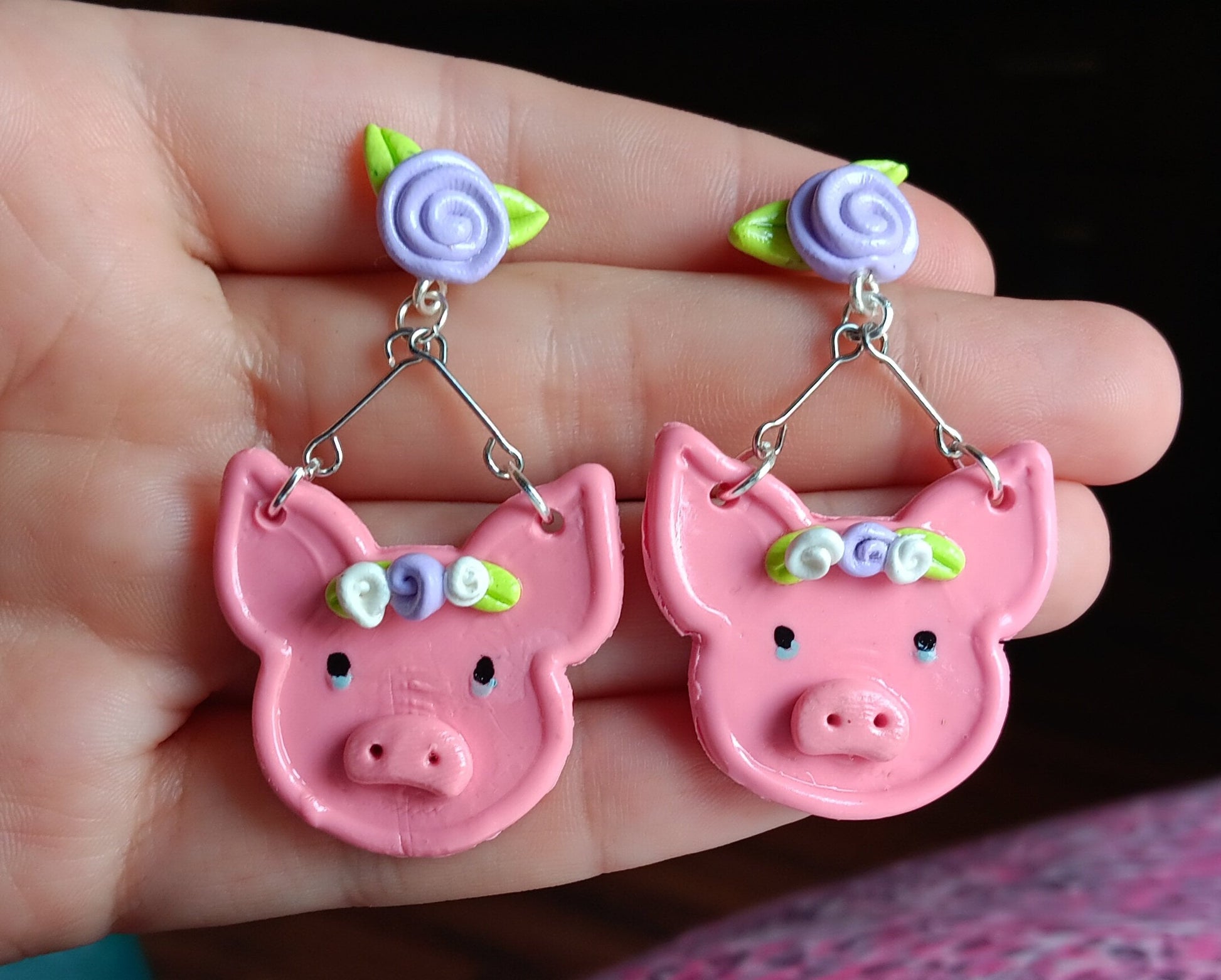 Kawaii floral pig earrings / polymer clay pink pig earrings / kawaii animal jewelry / floral earrings / lavender rose earrings
