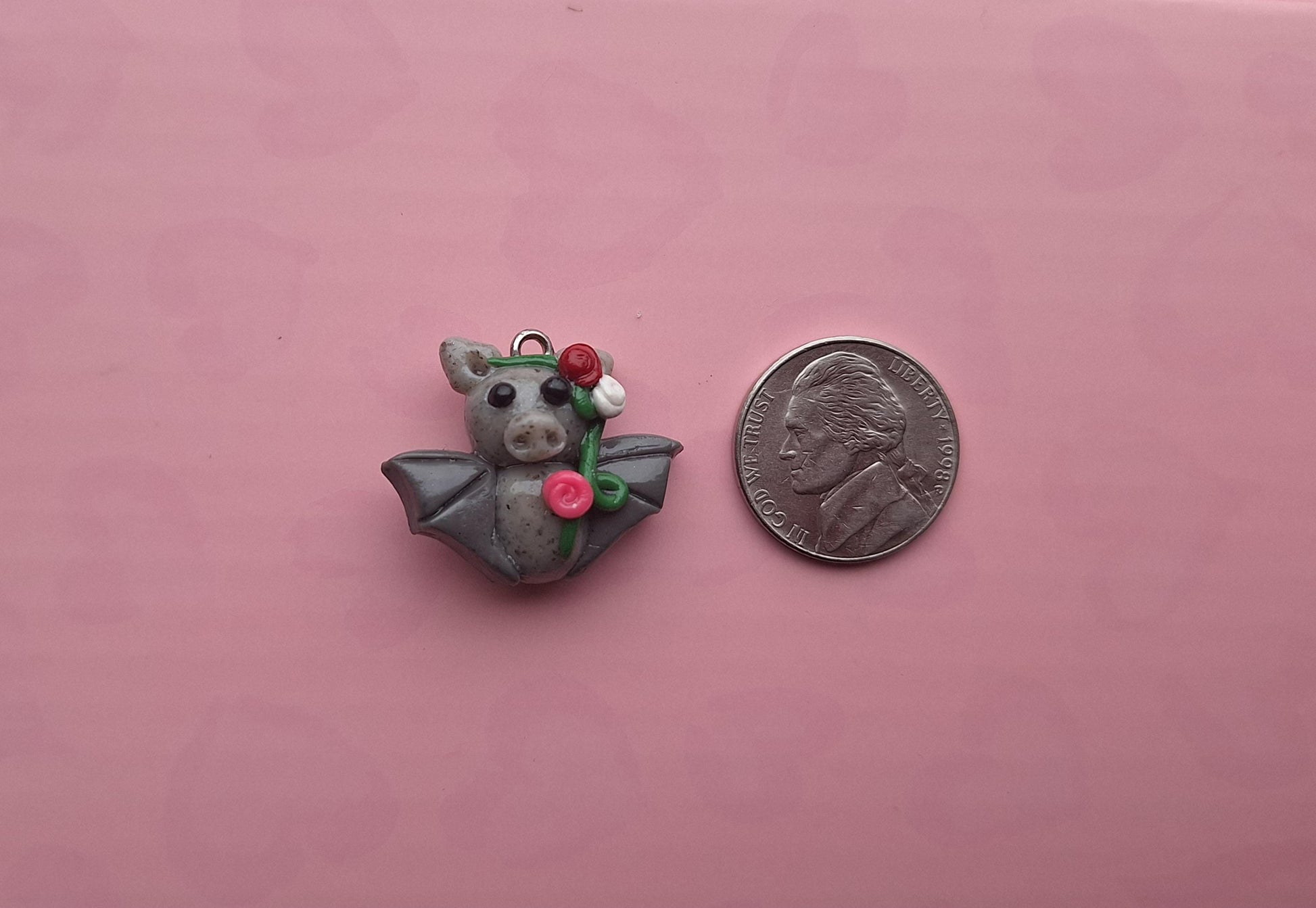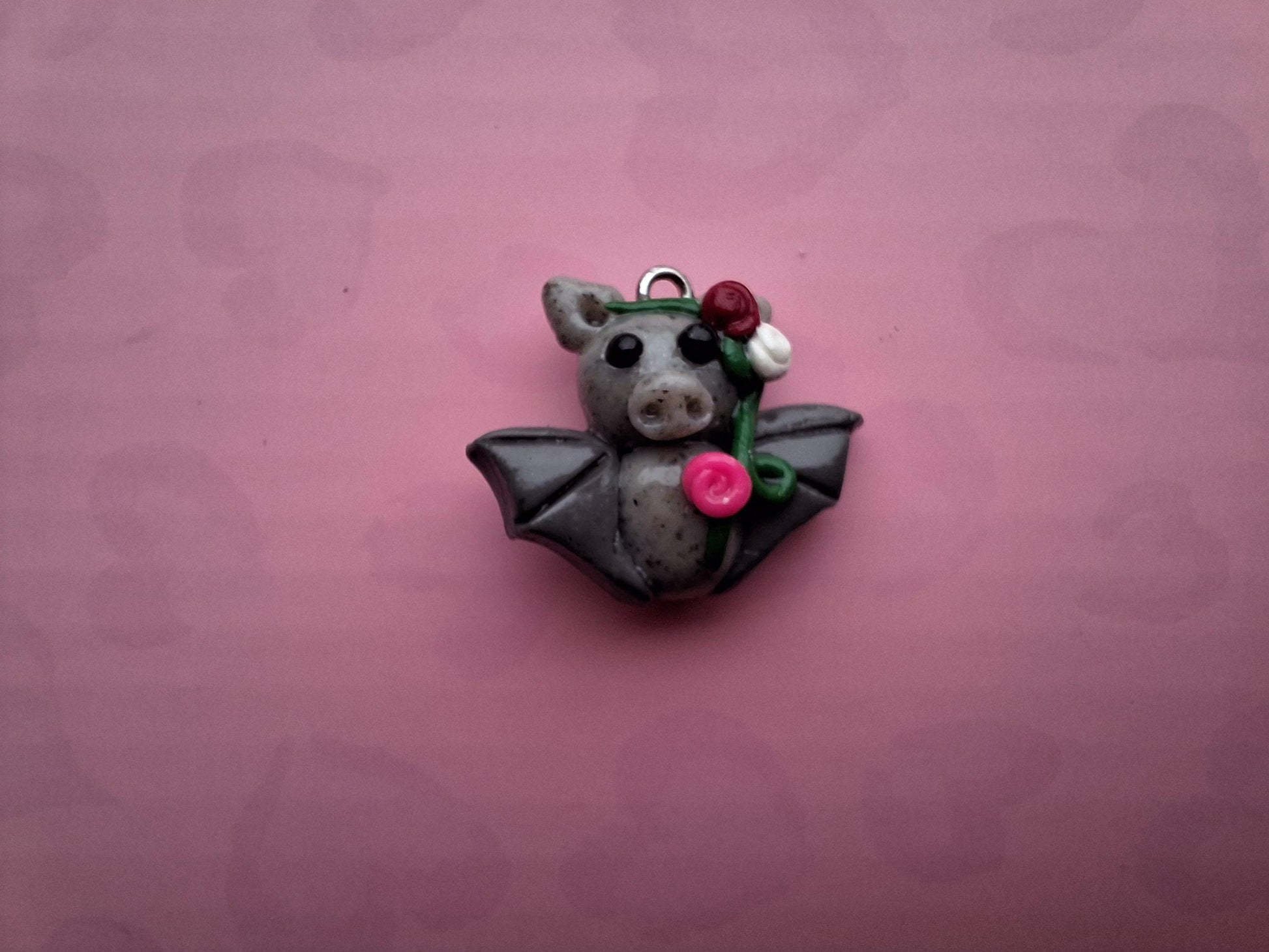Kawaii floral rose bat charm / polymer clay holiday charms / clay charm jewelry / bat charm stitch marker progress keeper