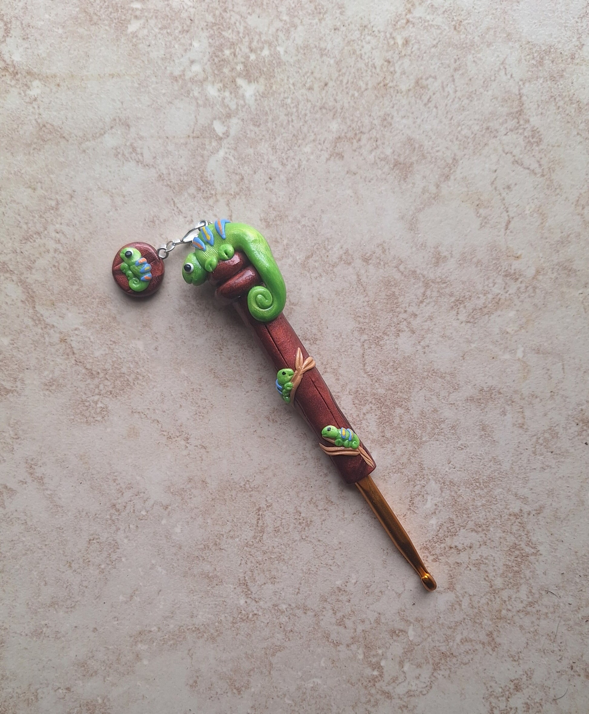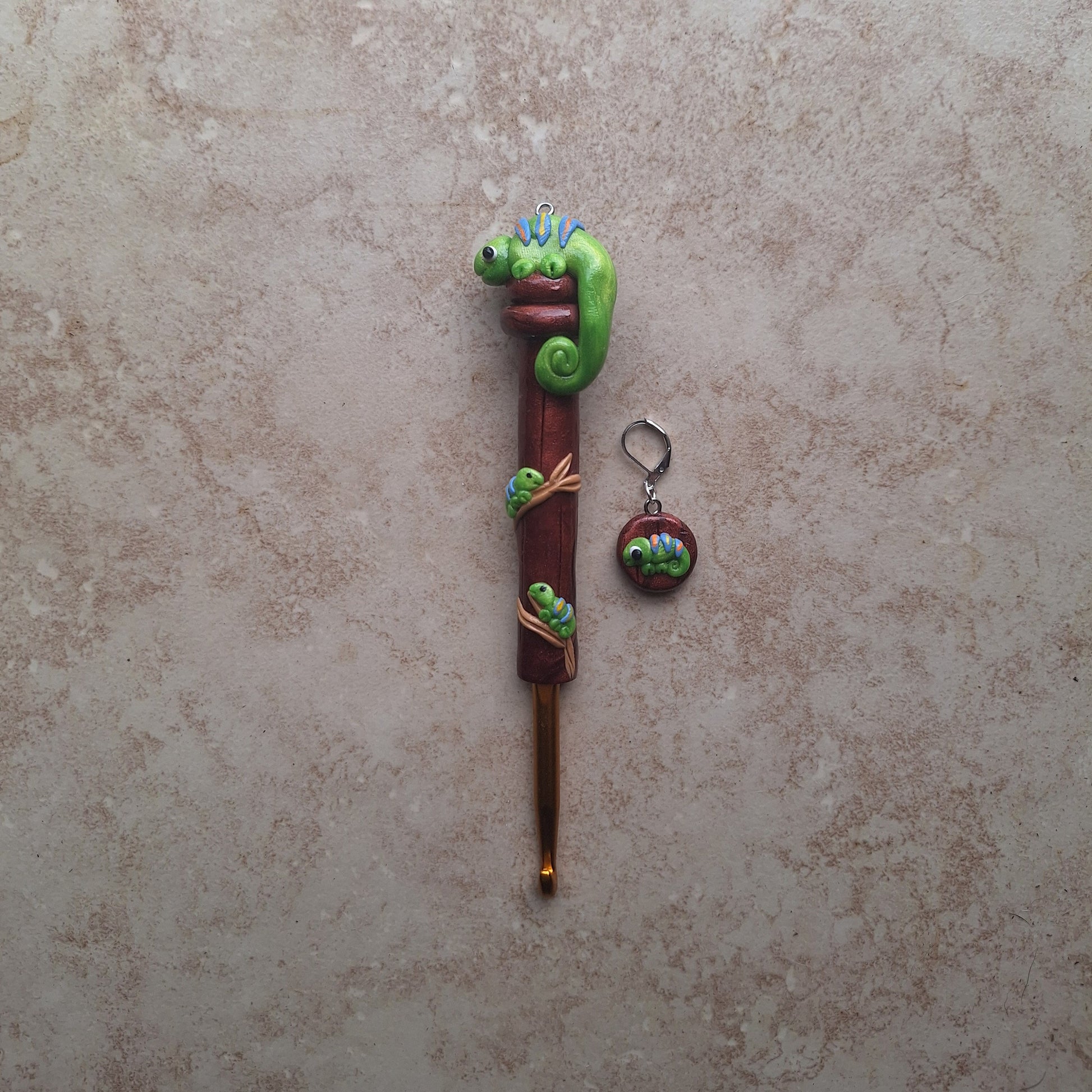 Polymer clay chameleon crochet hook with stitch marker / lizard salamander gecko crochet hook