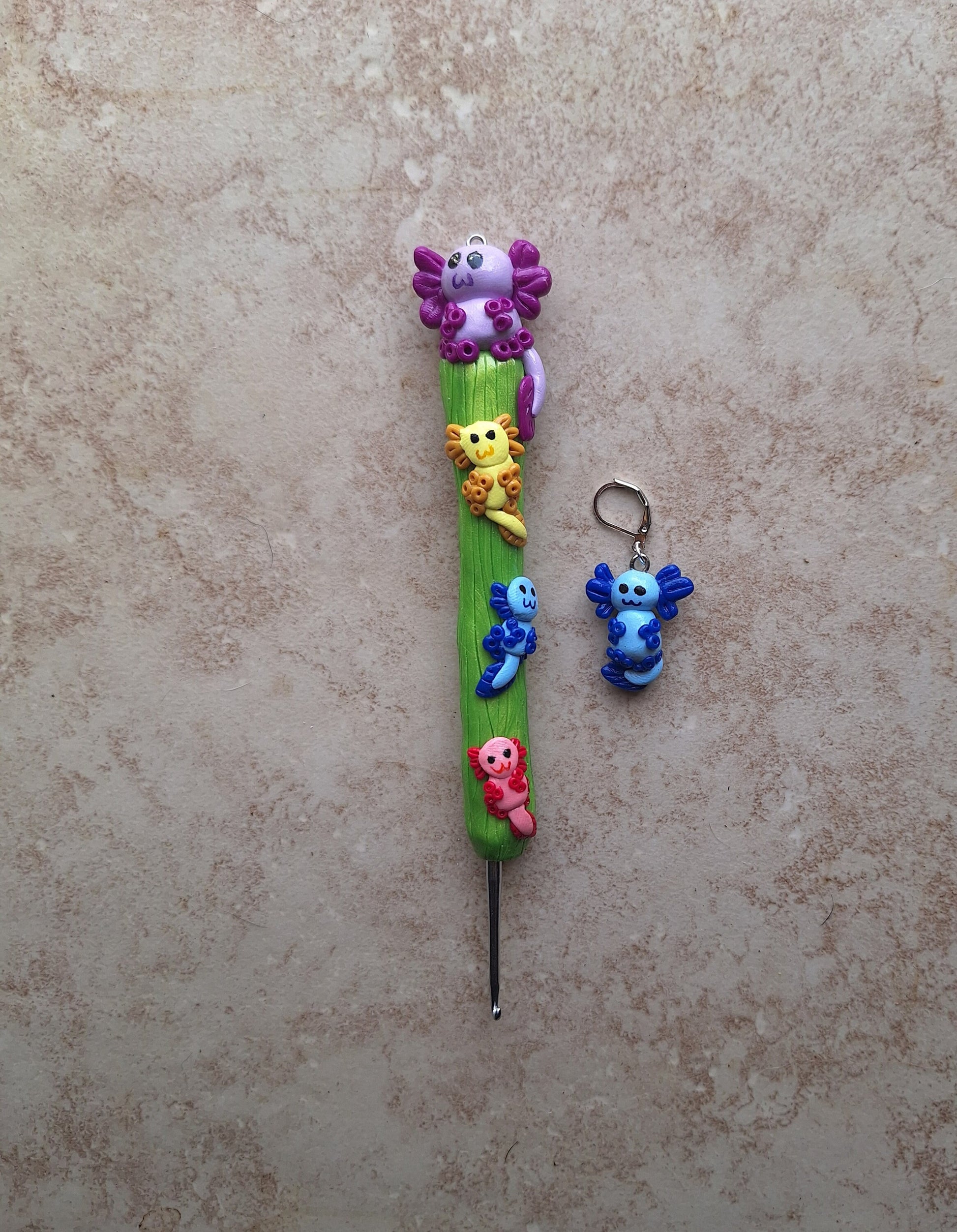 Polymer clay colorful axolotl crochet hook with stitch marker