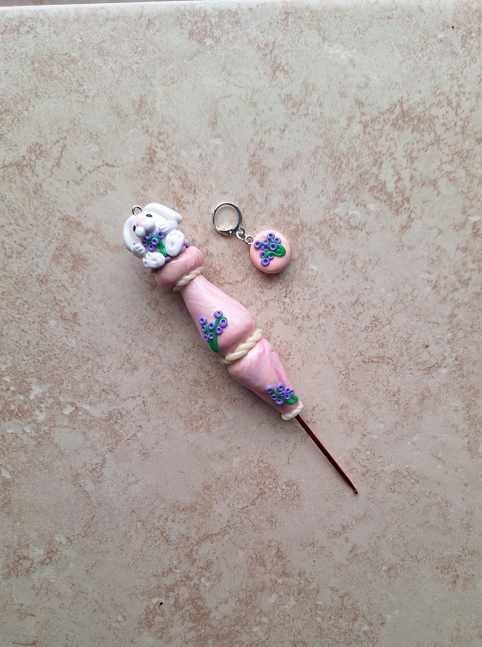 Polymer clay cute lavender bunny rabbit crochet hook with stitch marker