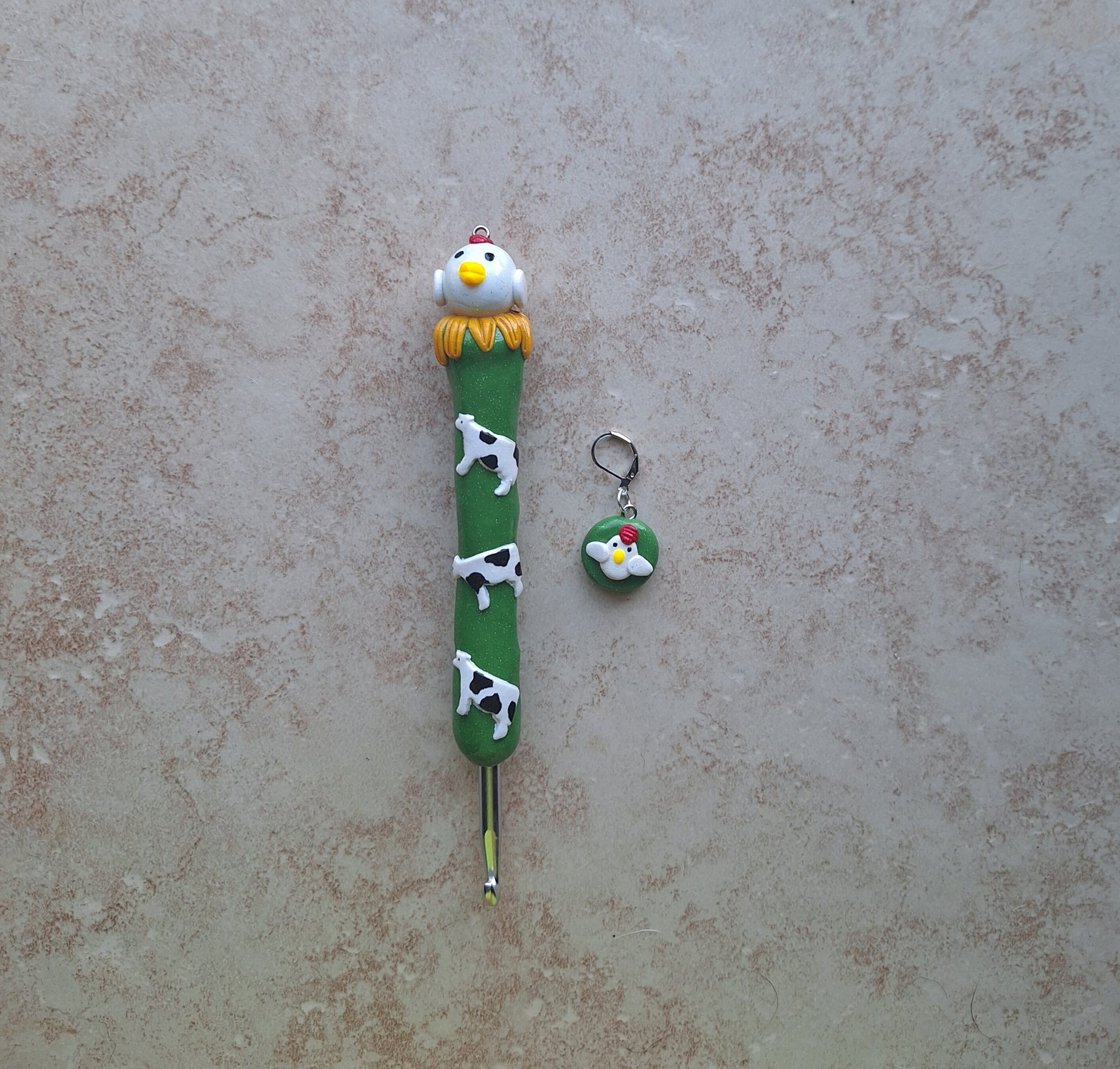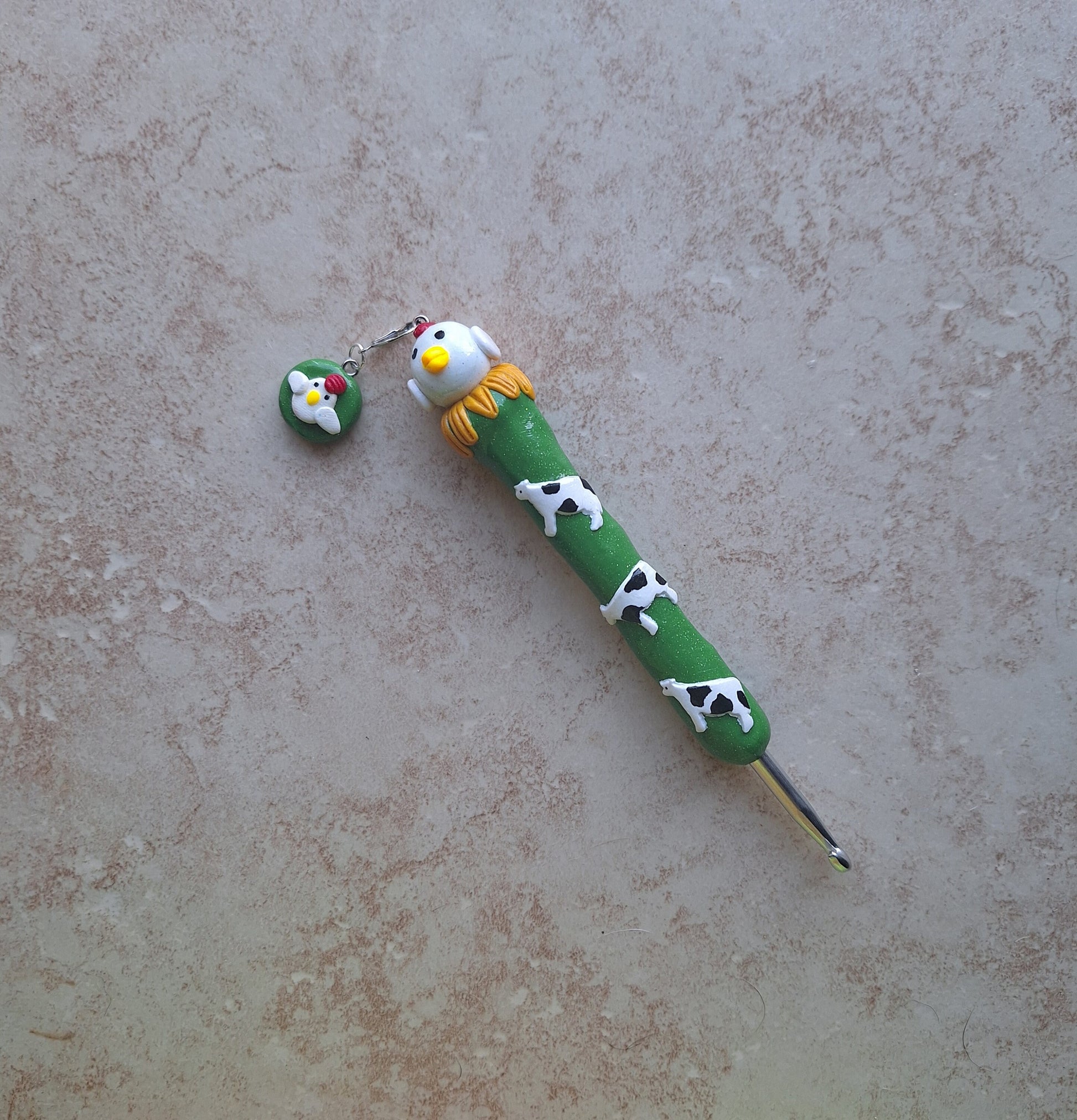 Polymer clay cute cow chicken crochet hook with stitch marker