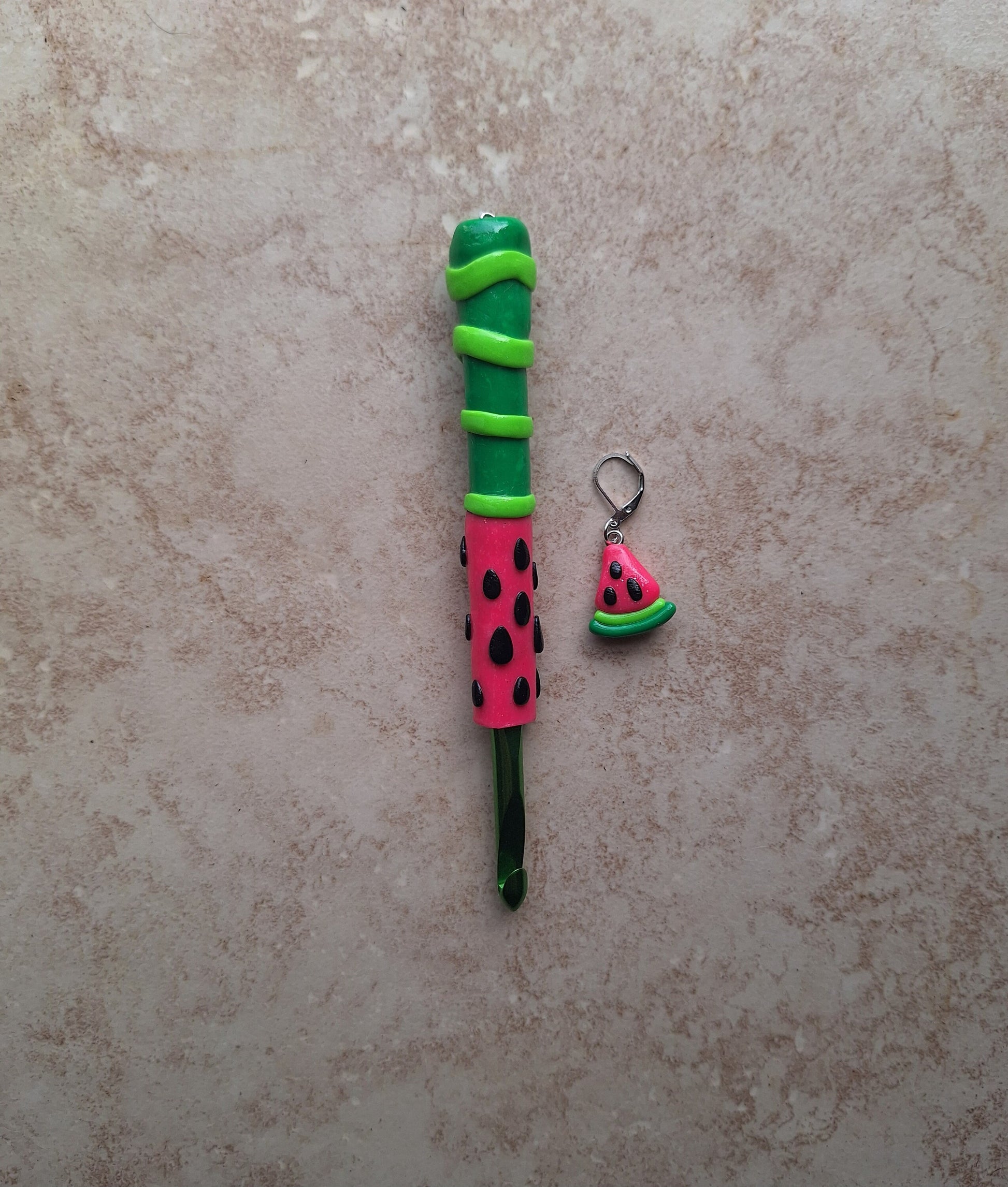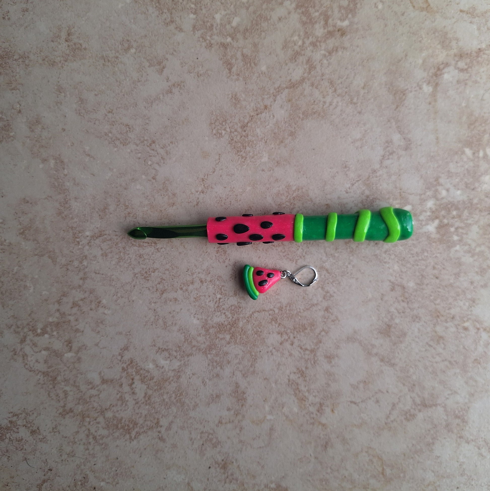 Polymer clay summer fruit watermelon crochet hook with stitch marker