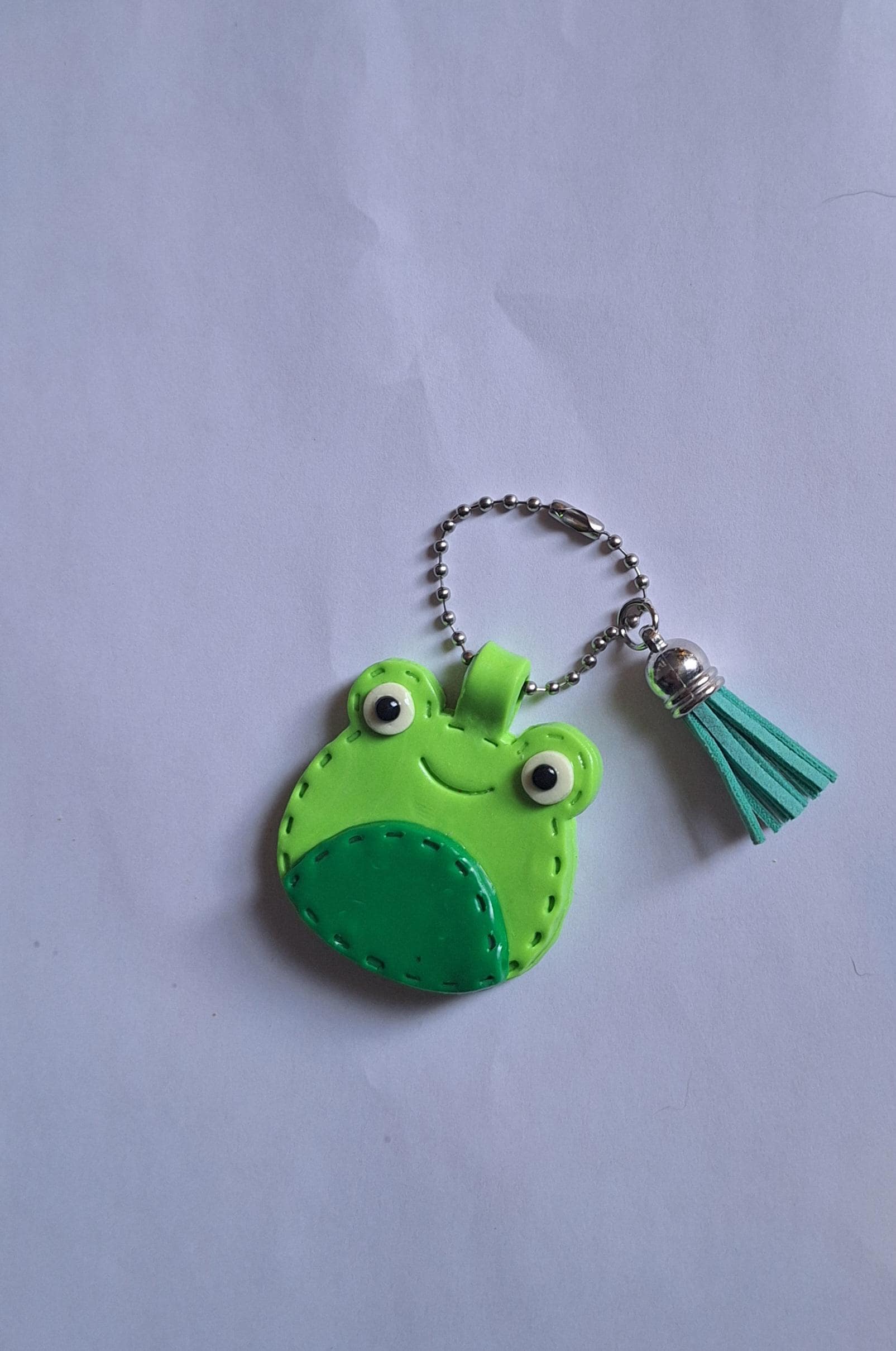Polymer clay green frog faux leather look stitch style keychain / cute clay frog bag accessories key chain