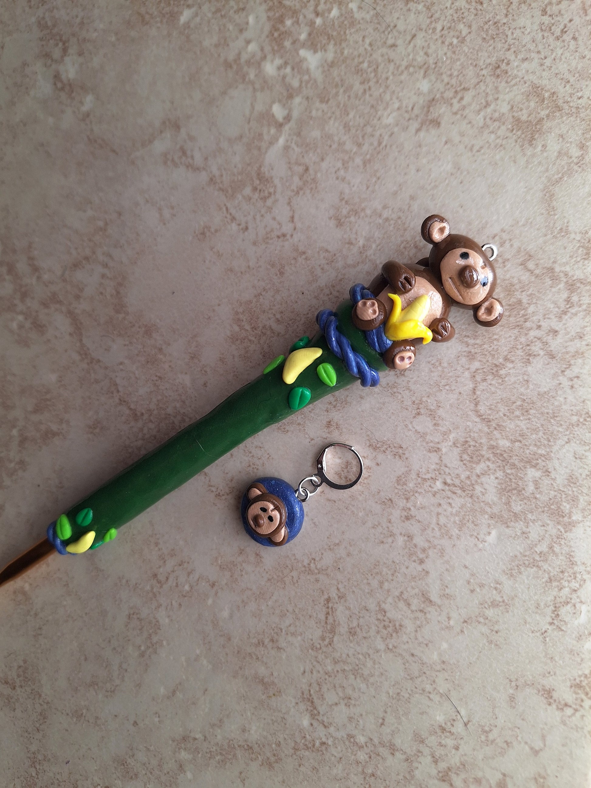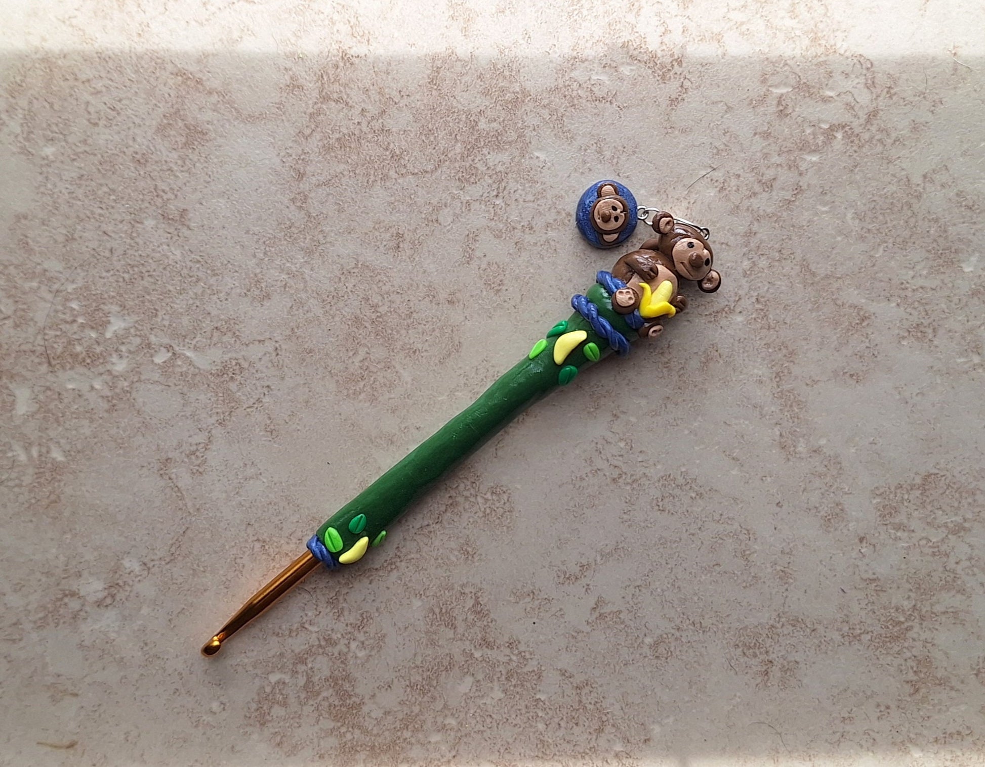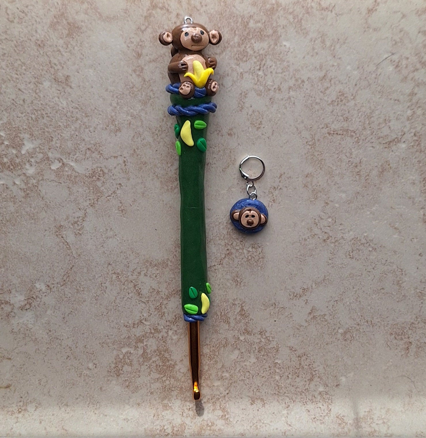 Polymer clay monkey banana jungle crochet hook with stitch marker