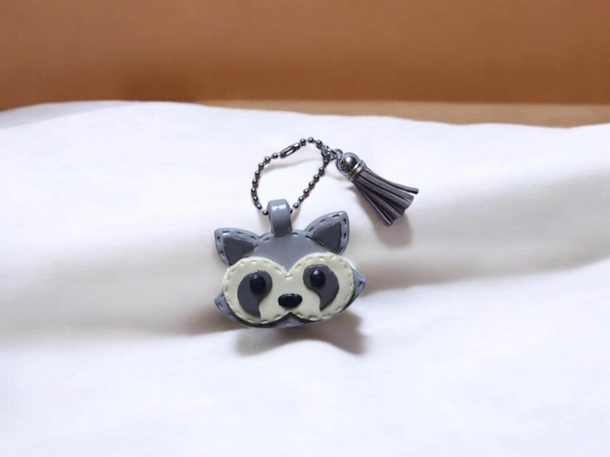 Polymer clay raccoon faux leather look stitch style keychain / cute clay raccoon bag accessories key chain