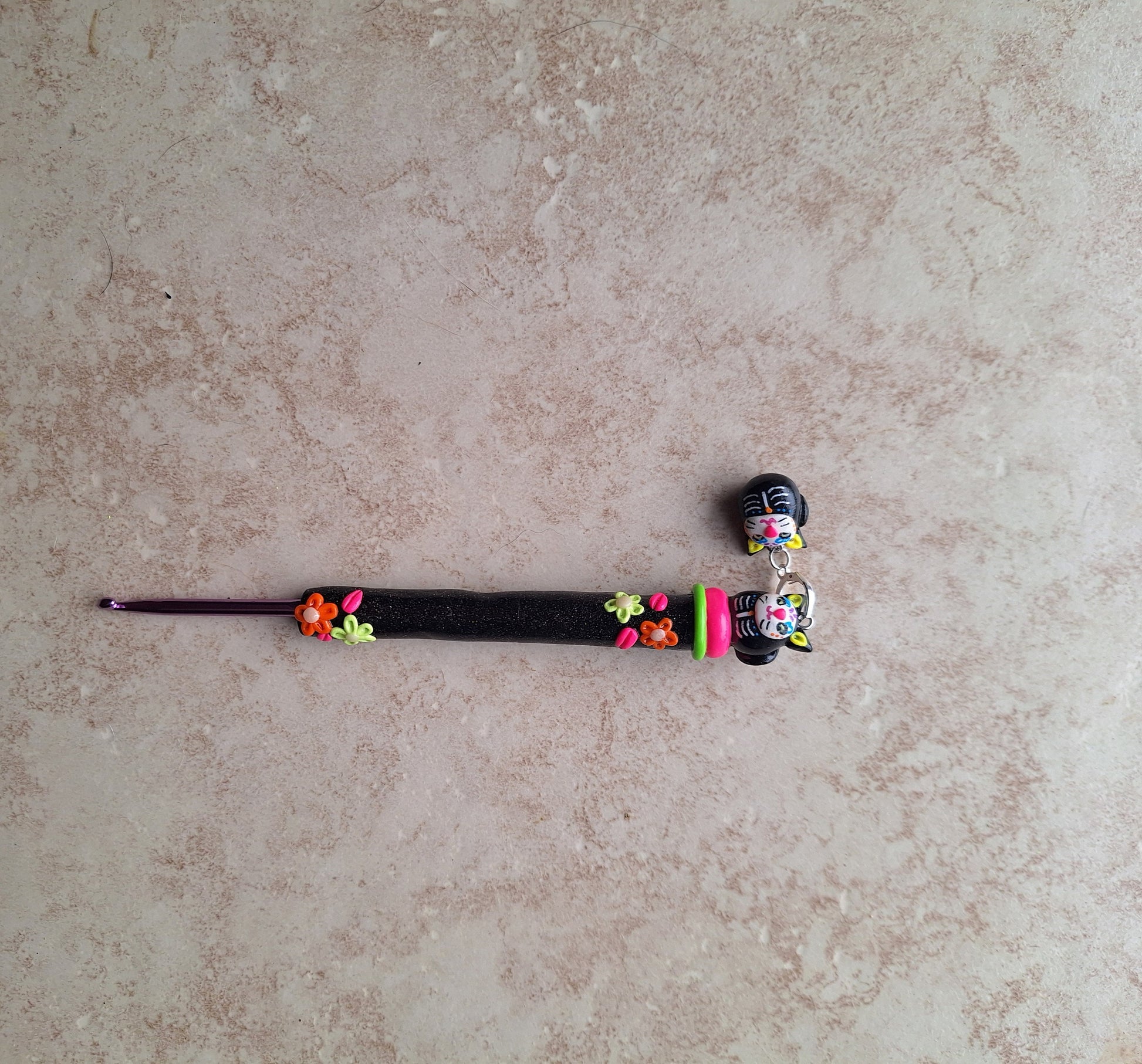Polymer clay sugar skull kitty cat day of the dead crochet hook