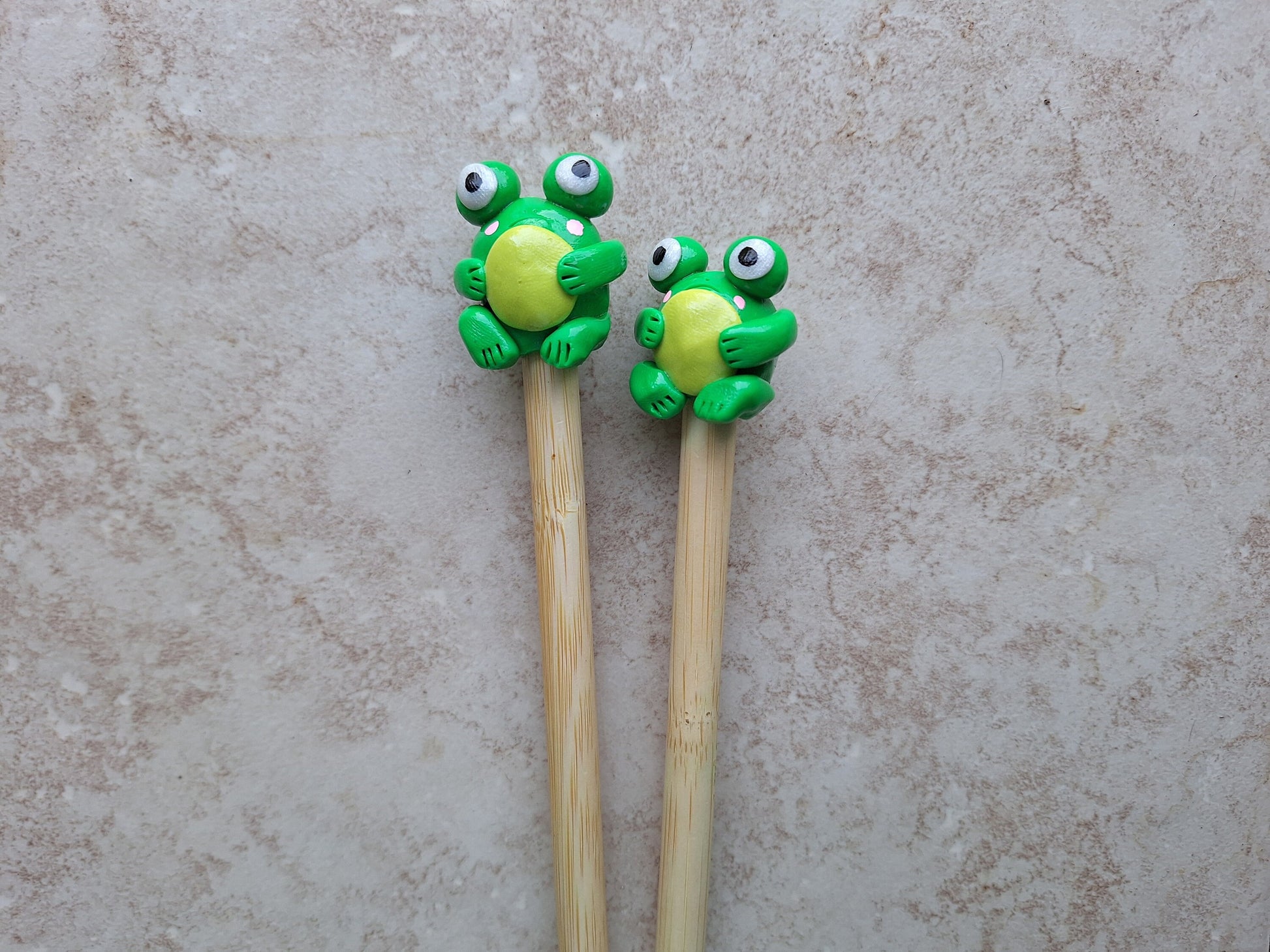 Set of 2 green frogs knitting needles / polymer clay knitting needles / decorative beach big eye frog needles knitting accessory crochet