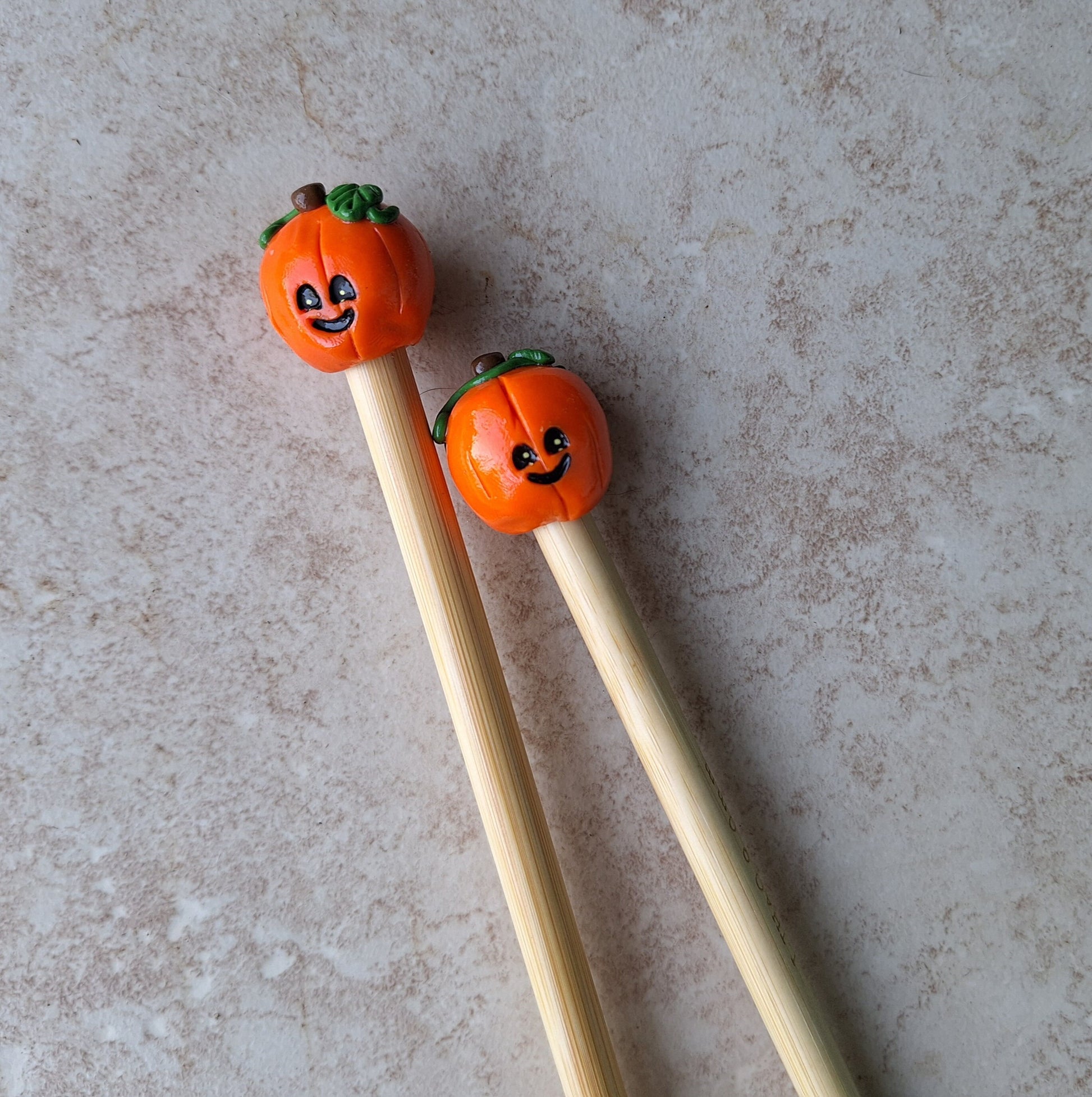 Set of 2 pumpkin jackolantern knitting needles / polymer clay knitting needles / decorative fall halloween needles knitting accessory croche