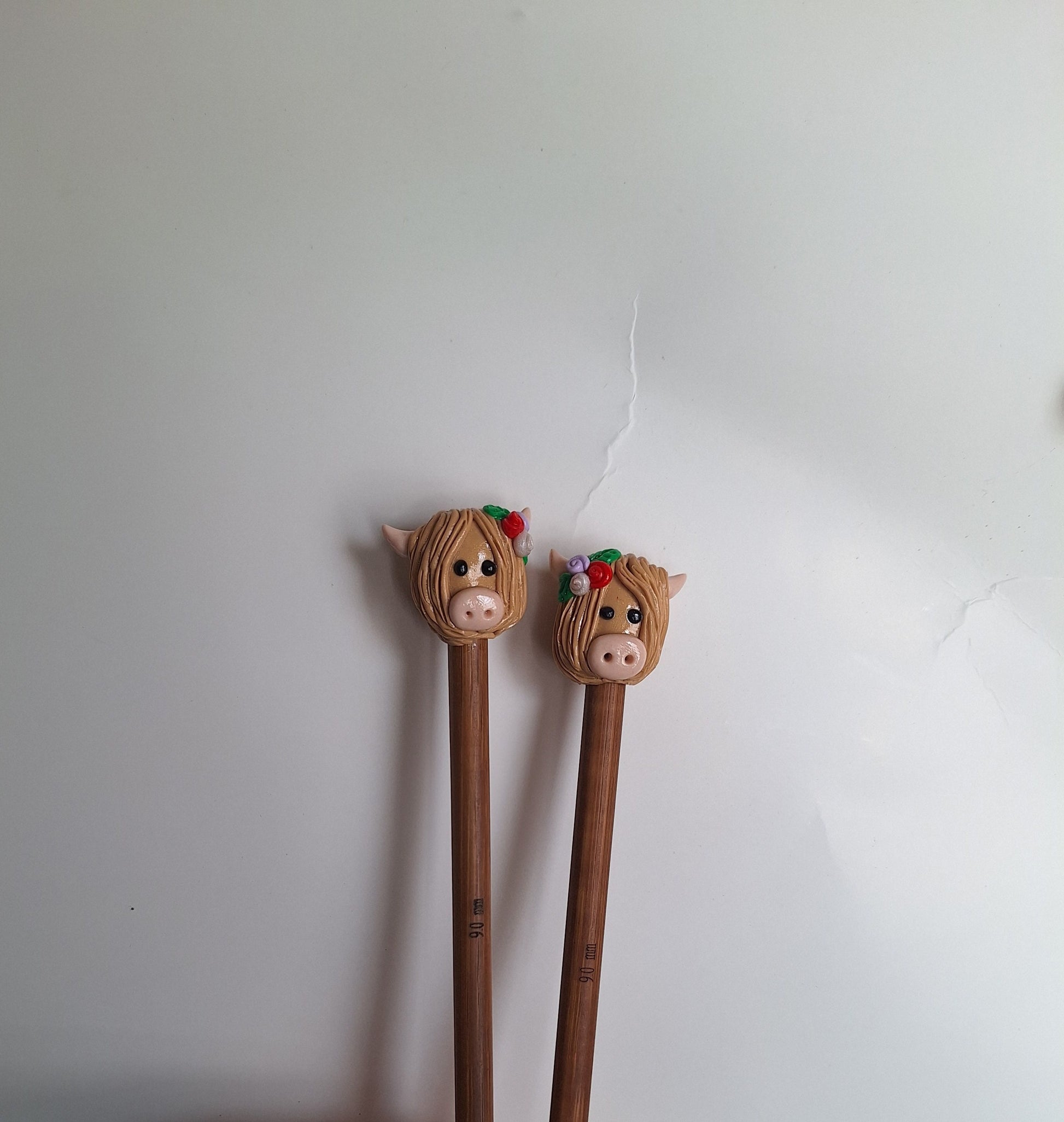 Set of 2 tan highland cow knitting needles / polymer clay knitting needles / decorative rose floral cow needles knitting accessory crochet