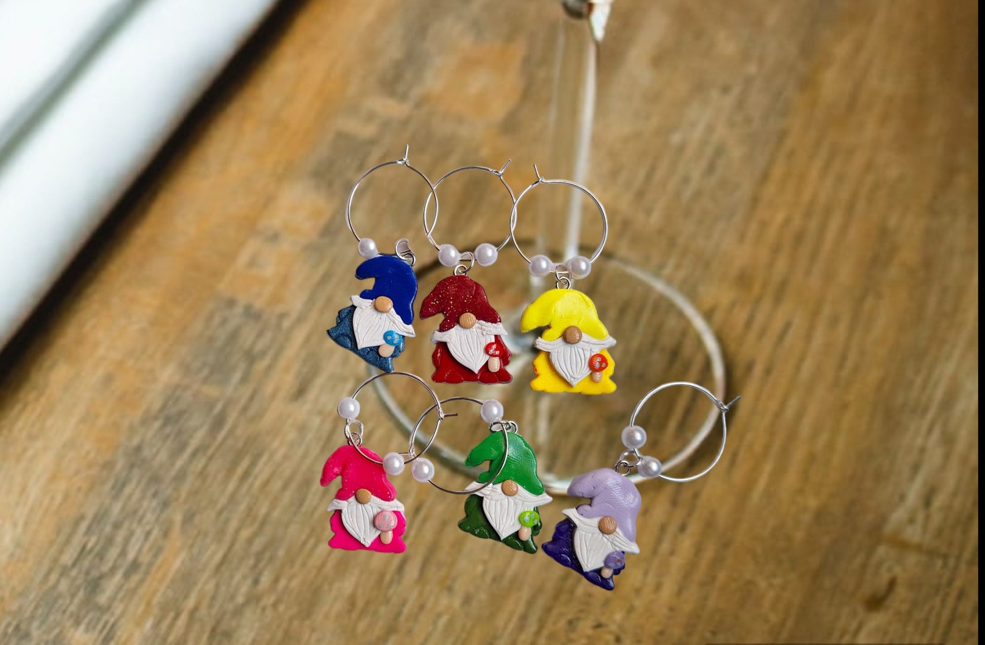 Set of 6 gnome mushroom wine charms / fairy toadstool wine charms / 6 set polymer clay colorful gnome wine charms