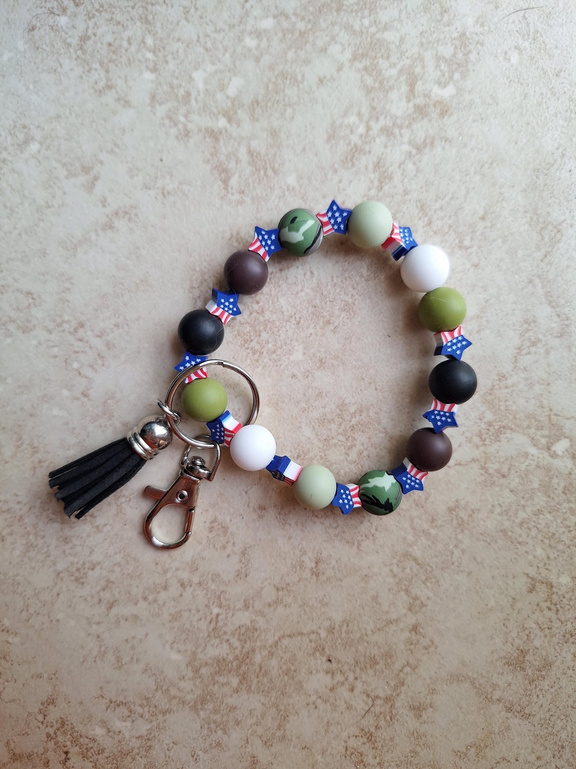 Silicone beaded wristlet / camo star red white blue silicone beaded wristlet keychain / USA bag accessories key chain