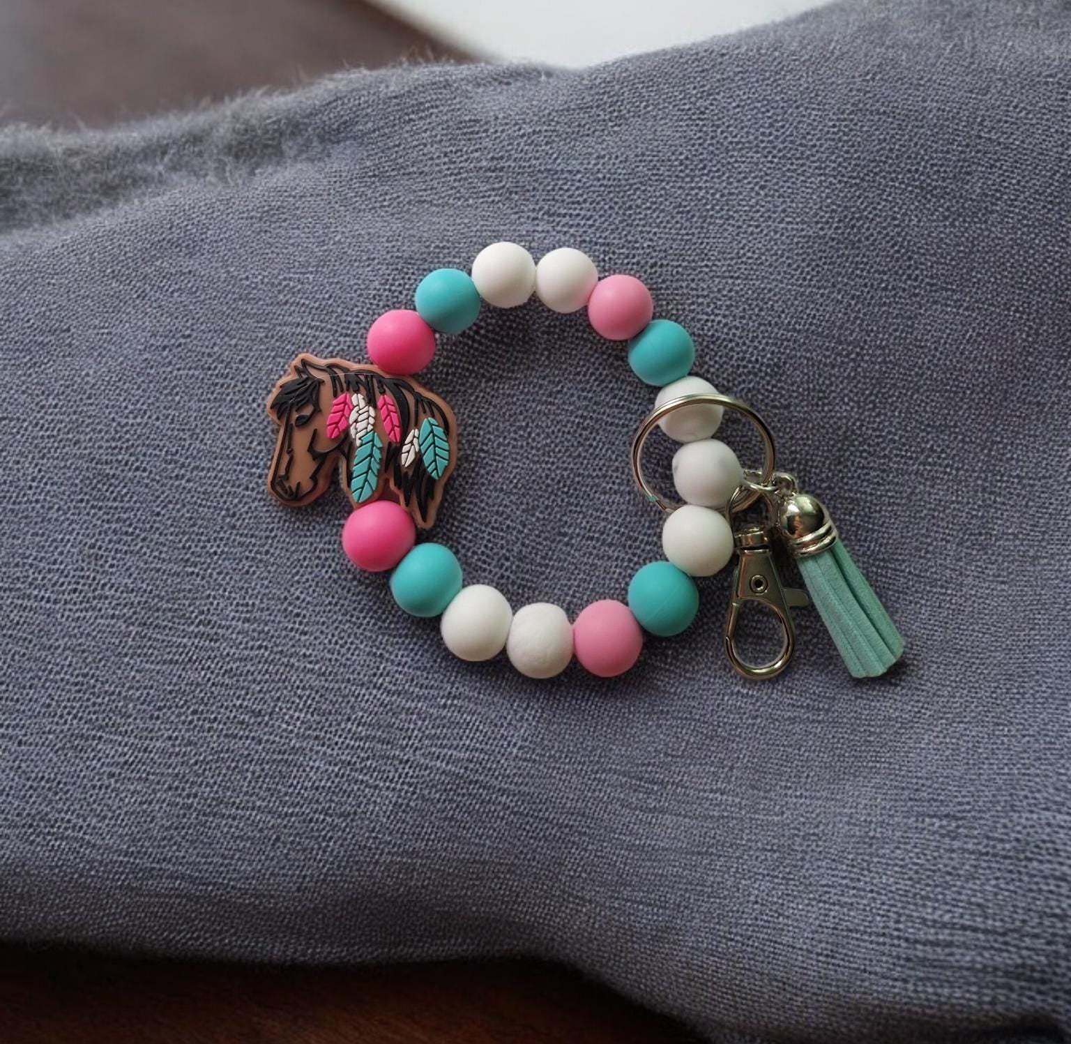 Silicone beaded wristlet / colorful horse with feathers silicone beaded wristlet keychain / country western bag accessories key chain