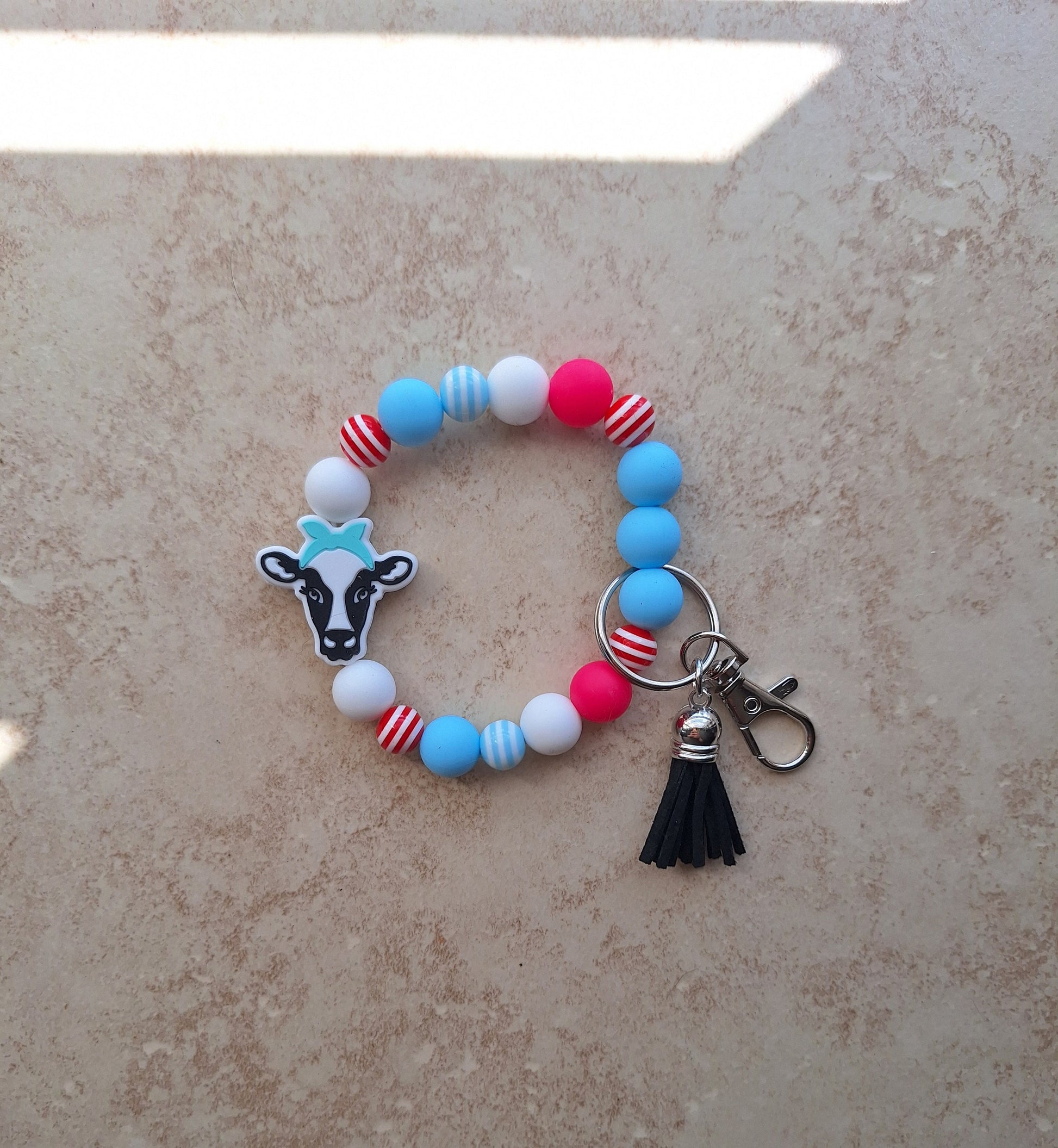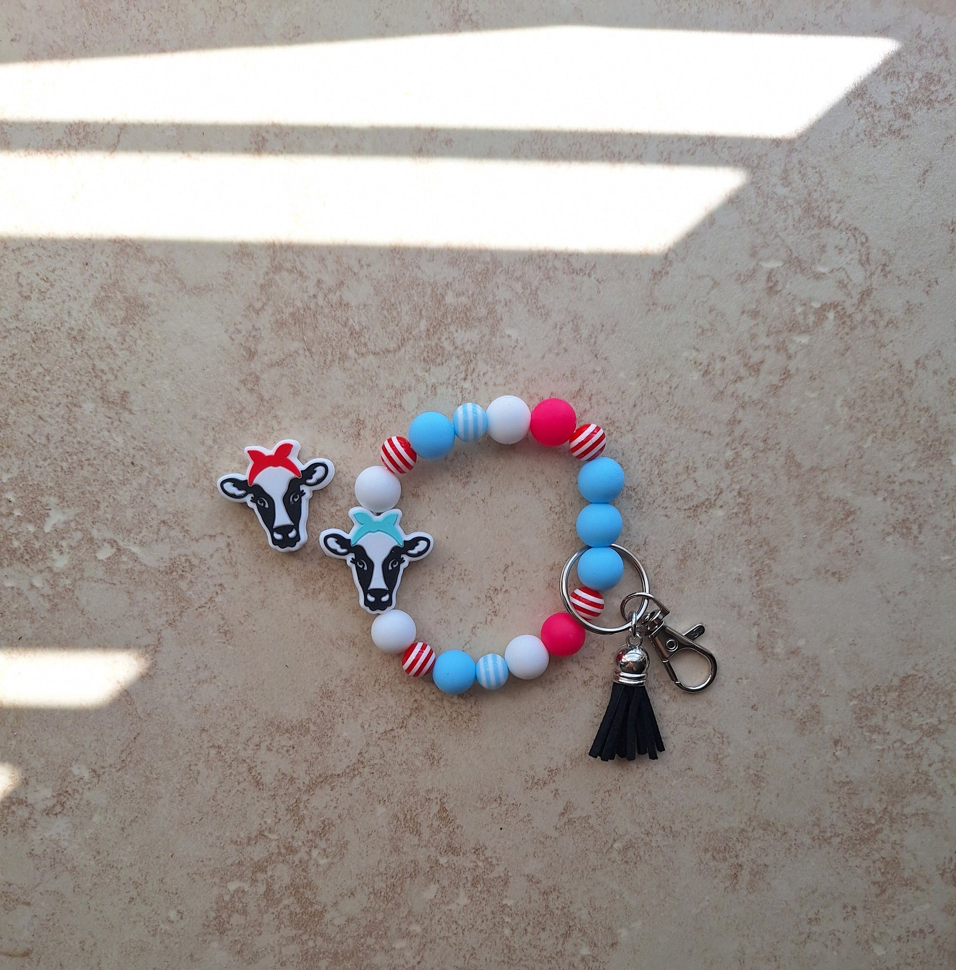 Silicone beaded wristlet keychain / cow with bow red teal silicone beaded wristlet keychain / bows and cows bag accessory key chain gift