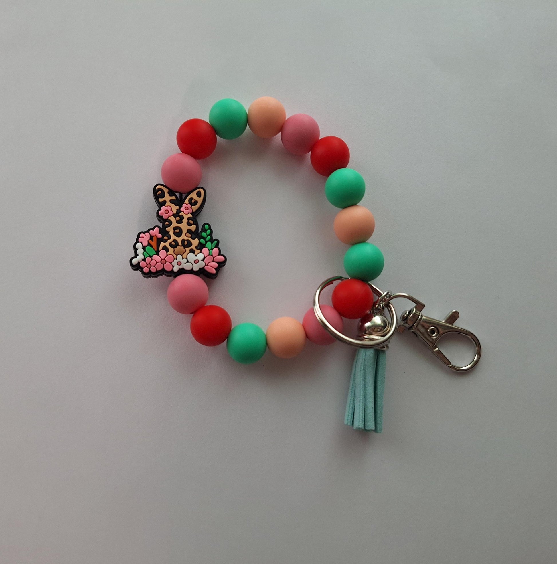 Silicone beaded wristlet keychain / leopard print floral bunny silicone beaded wristlet keychain / Easter faith bag accessories key chain