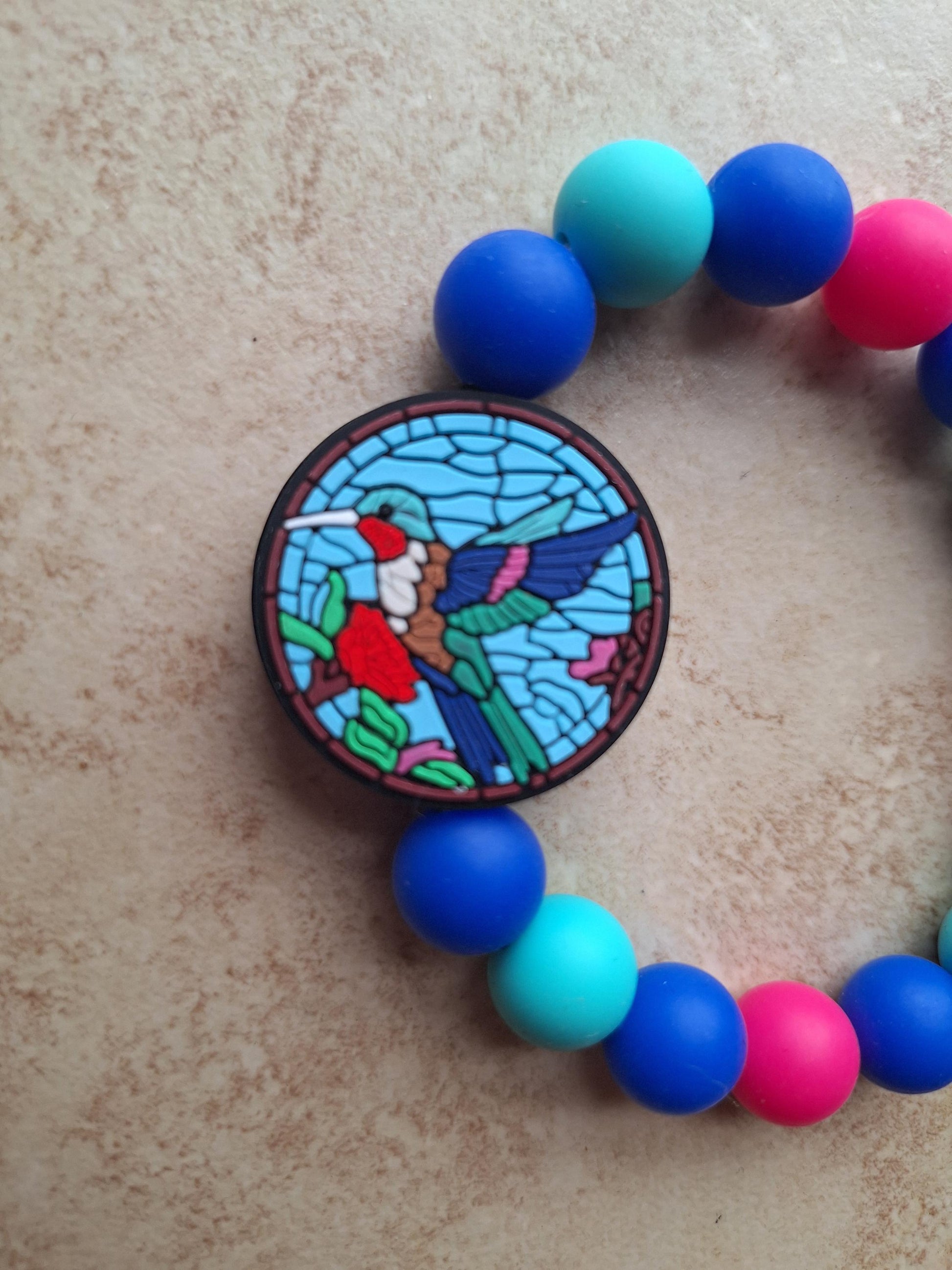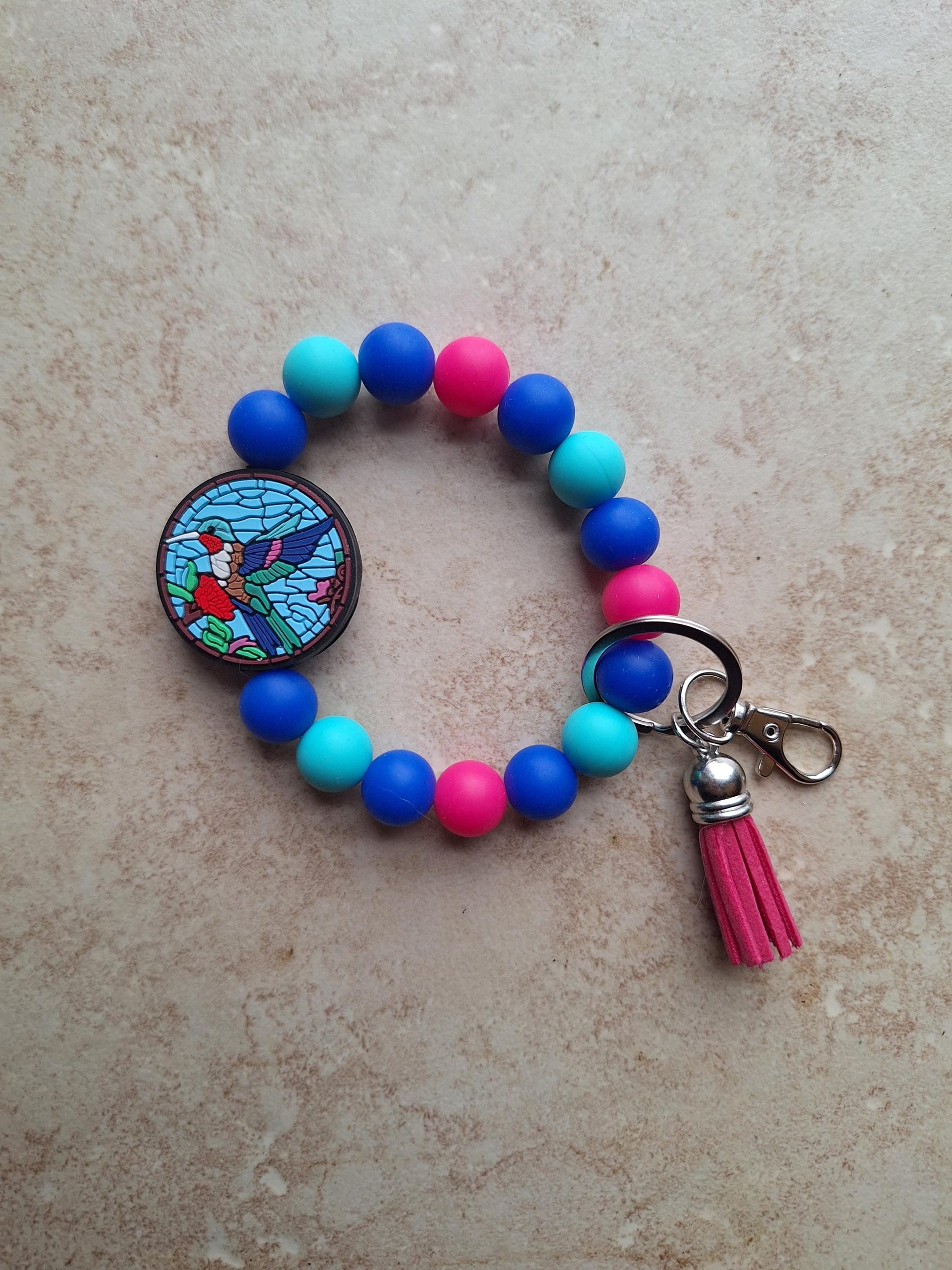 Silicone beaded wristlet keychain / pink teal hummingbird silicone beaded wristlet keychain / humming bird bag accessories key chain